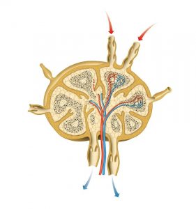 The lymph nodes receive and process lymphatic fluid. Lymphatic fluid is the fluid around the cells which is not cleared by blood vessels. Just like how blood vessels carry blood, lymphatic channels carry lymph fluid from one specific area towards the heart. In their path there are multiple stations of lymph nodes. The lymph nodes are rich in white blood cells. These cells process the lymphatic fluid for bacteria, virus and cancerous cells.